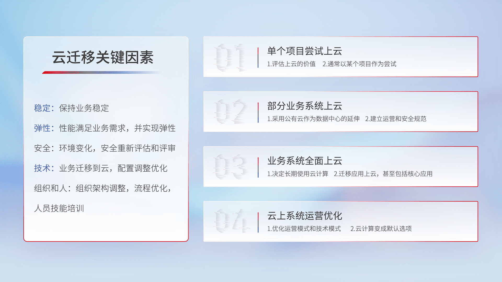 结合实际业务,,,从规划设计、、云平台选型、、、、云原生改造、、、数据迁移、、、集成交付,,迁移全过程为客户识别最佳上云路径,,做好风险识别管理,,,设计网络架构、、身份权限、、、安全审计合规、、、、操作审计、、、、日志审计、、监控告警策略、、、、多站点容灾设计等,,对云上基础设施进行整体规划,,,提升IT治理水平,,,,以满足弹性、、高可用、、、高性能的需求。。。